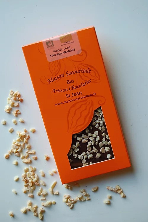 Ingrédients : Chocolat au lait Bio 45% [sucre de canne Bio, beurre de cacao Bio, poudre de cacao Bio, poudre de lait entier Bio, poudre de vanille naturelle Bio (vanille Bourbon de Madagascar)]. Amande Bio 20%.